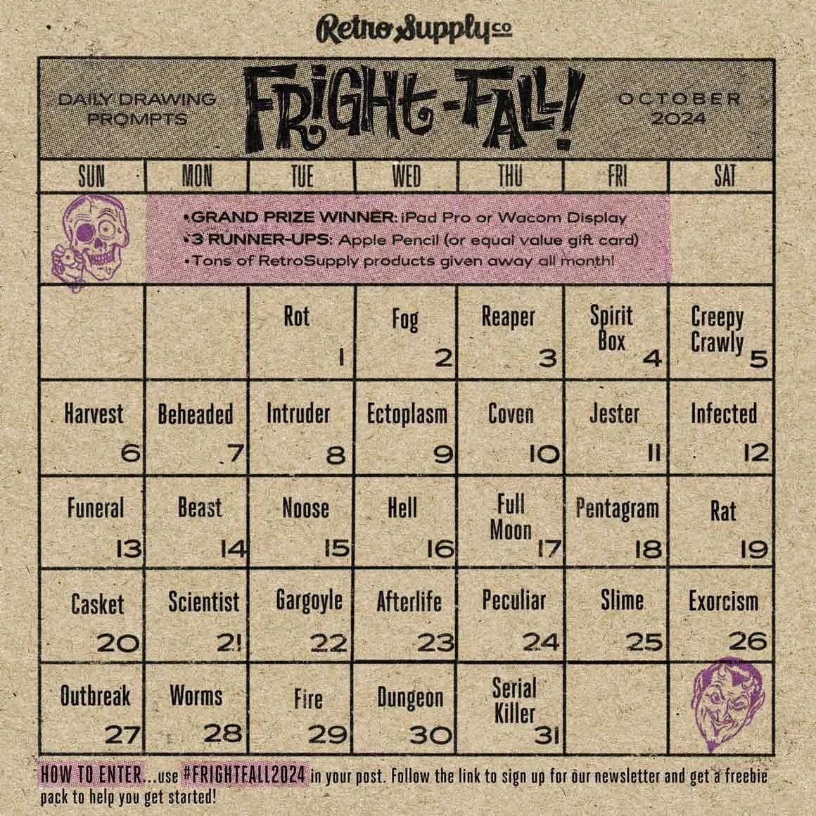 Here’s my 11.29% completed Fright-fall drawing challenge. A couple finished illustrations and a sketch. I came up with pretty decent concepts up to about mid-challenge, but they will likely never be realized.